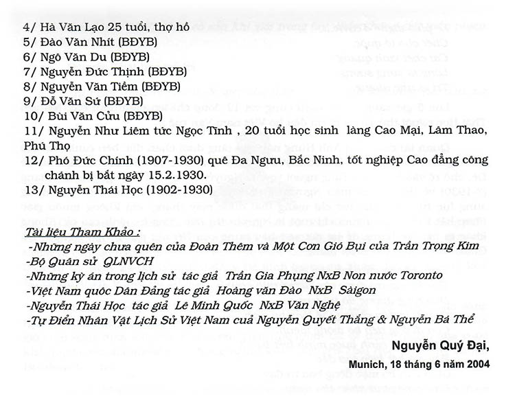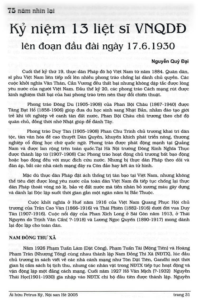 75 năm nhìn lại Kỷ niệm 13 liệt sĩ VNQDĐ lên đọan đầu đài ngày 17.6.1930 Nguyễn Quý Đại (Nguồn: Nội san Hè 2005, Hội Ái hữu Trung học Petrus Trương Vĩnh Ký tại Pháp) Share this: Click to share on X (Opens in new window) X Click to share on Facebook (Opens in new window) Facebook Like Loading...