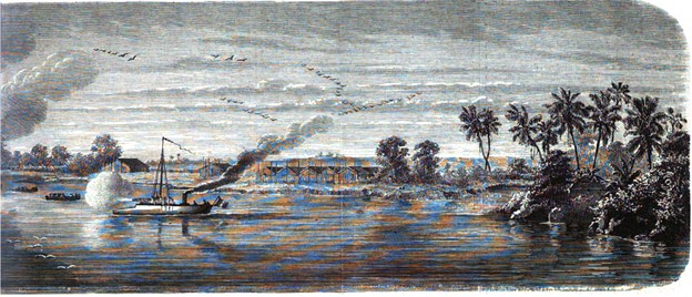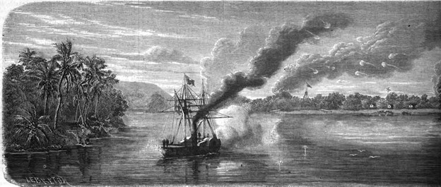 “Maître du huyện jusqu’au Donnaï, l’amiral prit immédiatement toutes les dispositions pour transporter les troupes sur la rive gauche; lui-même se rendit avec l’Ondine et une canonnière (capitaine Jonnart) devant la citadelle qui, masquée par des arbres, ne laissait voir qu’un mât de pavillon. Les deux navires essuyèrent impunément trois salves d’artillerie; par contre, au troisième coup de la canonnière, le tir de l’ennemi cessa et un vaste embrasement se fit voir au-dessus de la place.”[33]