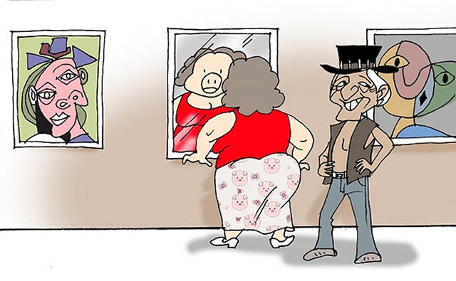 Rồi tuần sau, hai vợ chồng nó đi xem triển lãm tranh. Con Su nó nói: “Cha nào vẽ con heo nái nầy sao mà xấu hoắc?” Mái cồ quay lại nói: “Đâu phải là bức tranh. Nó là cái gương soi mặt đó!”