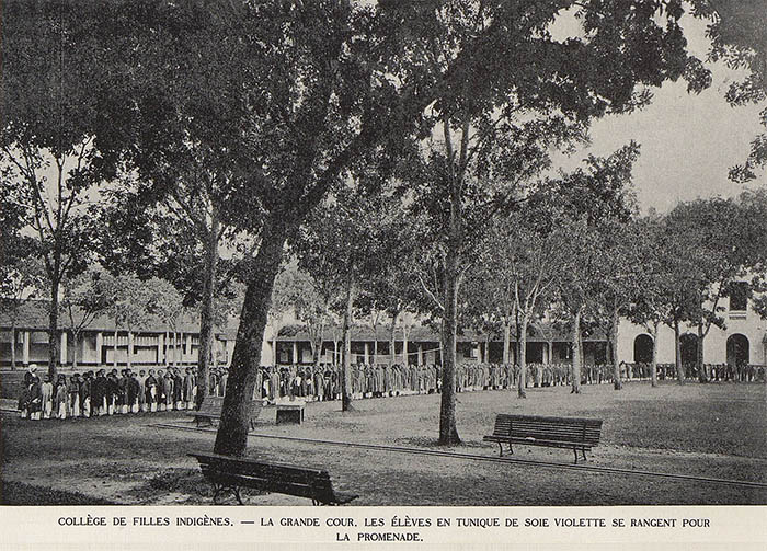 Các nữ sinh mặc áo dài lụa tím xếp hàng đi dạo trên sân trường Nữ trung học Bản xứ.