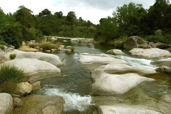 Giữa đường dừng chân lội bộ 20 phút là đến con suối Đá Giăng . Tôi thò đầu ra cửa xe để phóng tầm mắt hướng về con suối, nhưng không dừng lại vì sợ trở xuống núi không kịp .