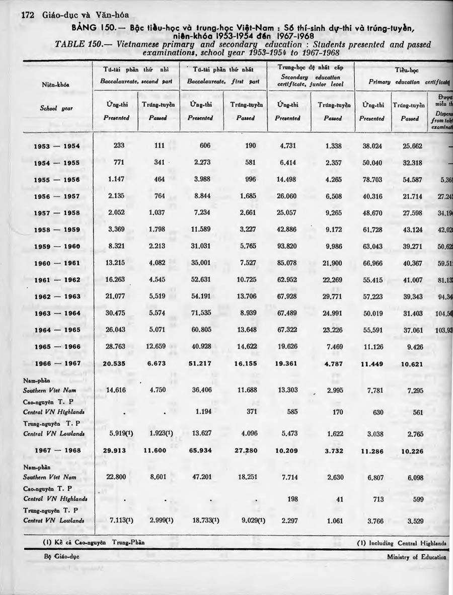 Bậc tiểu học và trung học Việt Nam: Số thí-sinh dự-thi và trúng-tuyển, niên-khóa 1953-1954 đến 1967-1968 (nguồn: Niên Giám Thống Kê 1969, Viện Quốc Gia Thống Kê) Võ Phi Hùng sưu tập Share this: Share on X (Opens in new window) X Share on Facebook (Opens in new window) Facebook Like Loading...