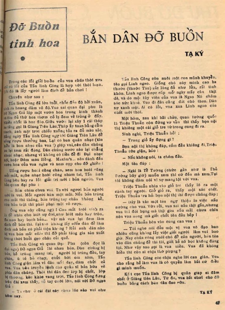 Bắn dân đỡ buồn Tạ Ký (nguồn: tuần báo Đời số 110, ngày 25-11-1971) Võ Phi Hùng sưu tập Share this: Click to share on X (Opens in new window) X Click to share on Facebook (Opens in new window) Facebook Like Loading...