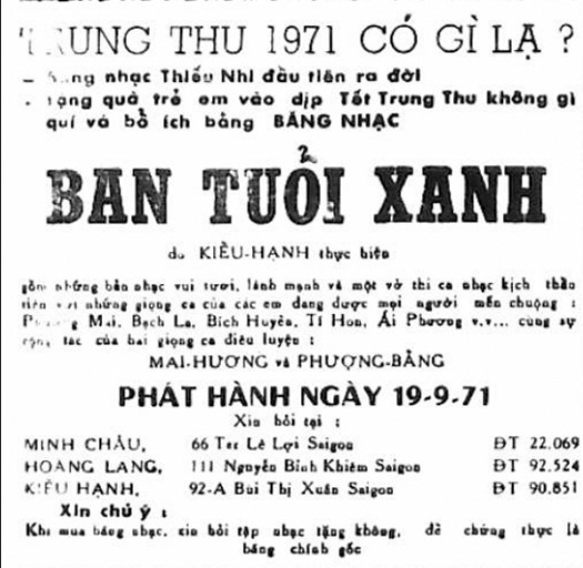 Năm 1971, bà Kiều Hạnh cho phát hành cuốn băng nhạc của ban thiếu nhi Tuổi Xanh và cũng là băng nhạc duy nhất của ban “Tuổi Xanh” trước ngày mất nước. Nội dung cuốn băng gồm những ca khúc vui tươi, lành mạnh như “Học sinh hành khúc”, “Em bé quê”, “Mùa thi”, v.v.. và vở ca nhạc kịch “Bé Tâm và thỏ ngọc”. Phần âm nhạc với sự góp tay của các nhạc sĩ Nguyễn Ánh 9 (dương cầm), Xuân Lôi (flute và clarinette), Ngọc Huyền (mandolin), Thoại Quý (bass) và Thoại Kim (trống).