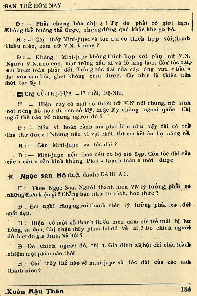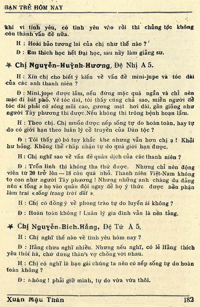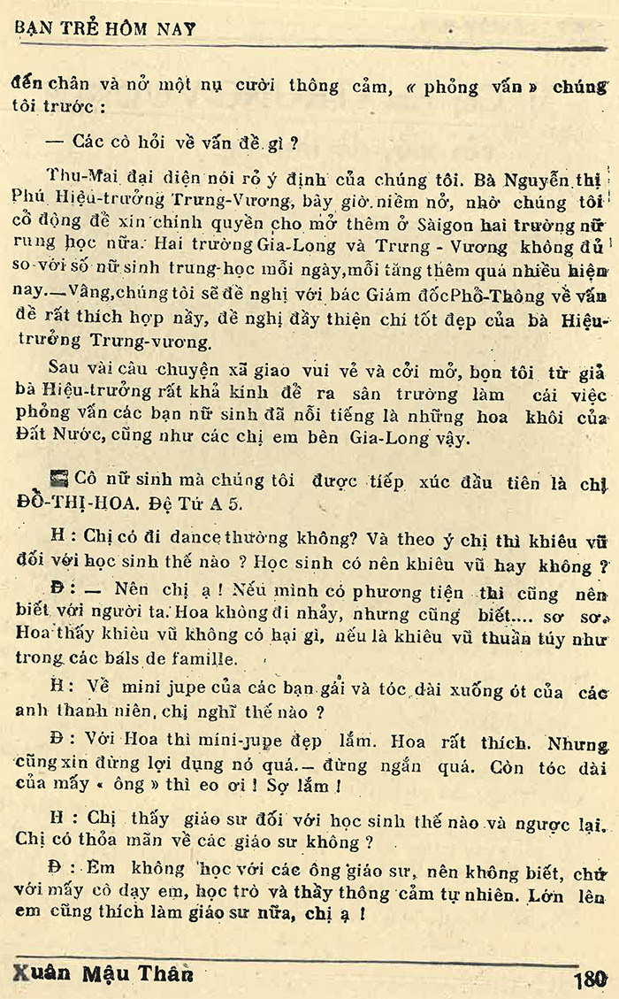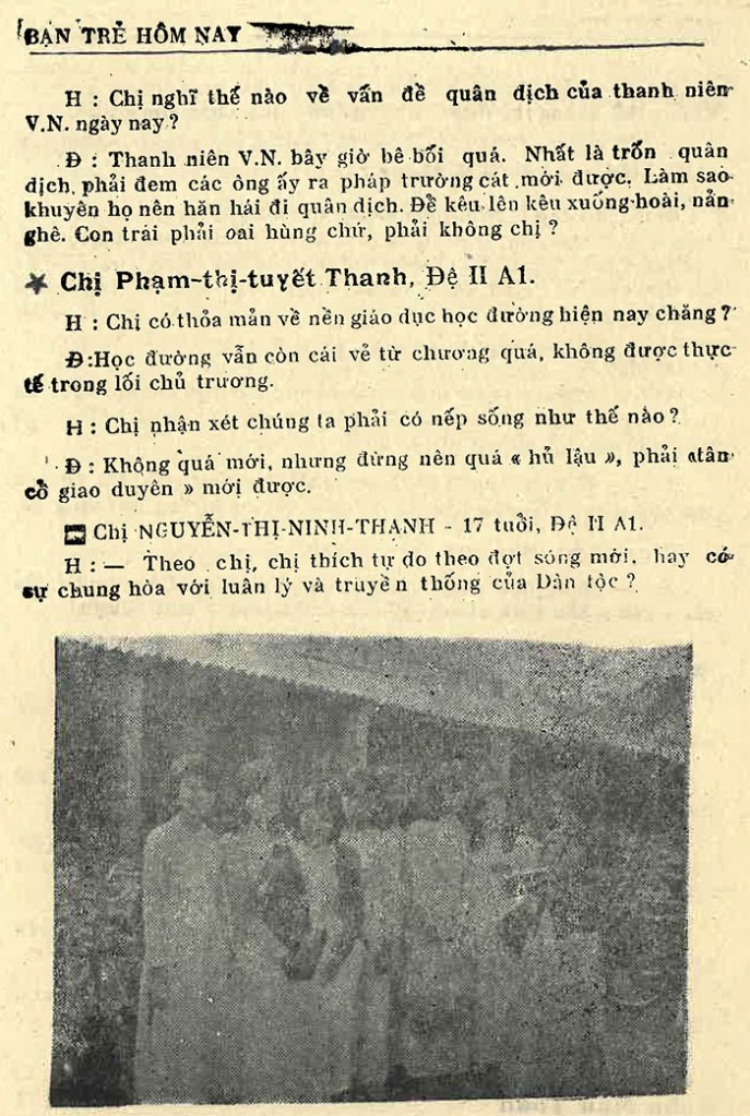 Vào đầu năm 1968, tạp chí Phổ Thông [1] đã thực hiện một cuộc phỏng vấn đến một số học sinh các trường trung học lớn tại Sài Gòn, và đăng tải liên tục trên 4 số báo. Theo sự dự định ban đầu thì nhóm phỏng vấn và chụp ảnh với 4 cô đặc phái viên (ĐPV) Phổ Thông sẽ tiếp xúc sâu rộng với các học sinh và sinh viên nam, nữ không những chỉ riêng ở thủ đô Sài Gòn, mà còn khắp nơi trên toàn quốc. Vì biến cố Tết Mậu Thân, nên có sự gián đoạn từ bài đầu đăng tải vào ngày 15-1-1968 (số 207), và mãi đến 3 tháng sau mới có số báo kế tiếp vào ngày 15-4-1968 (số 208) và kết thúc ngày 15-5-1968 (số 210).