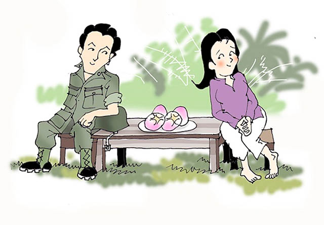 Ngó vô nhà thấy có một đứa còn kẹp tóc, ngồi đưa võng ru con. Thằng “tà lọt” bỏ nhỏ: “Ông Thầy, con Mận ru em nó đó. Không phải ru con đâu. Nó chưa chồng. Em tính xáp vô mà nó chê em dốt. Tía Mận làm hương sư, là thầy giáo làng đó. Con gái khoái quan chê lính. Chắc nó chịu đèn ông Thầy rồi. Ủi tới đi ông Thầy. Chắc ăn như ăn Mận. Em de ra nhường cho ông Thầy ủi vô. Hu hu! Ðể em dắt ông Thầy đi mua mận. Xong, ông Thầy kiếm cớ ngồi đàm đạo, tụi em rút ra ngoài canh chừng Việt Cộng”.