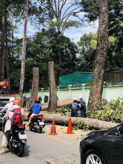 Những cây dầu lâu năm ở đường Nguyễn Bỉnh Khiêm đang bị đốn hạ. Ảnh chụp trưa 26.11. Ảnh: Chiến Bầu