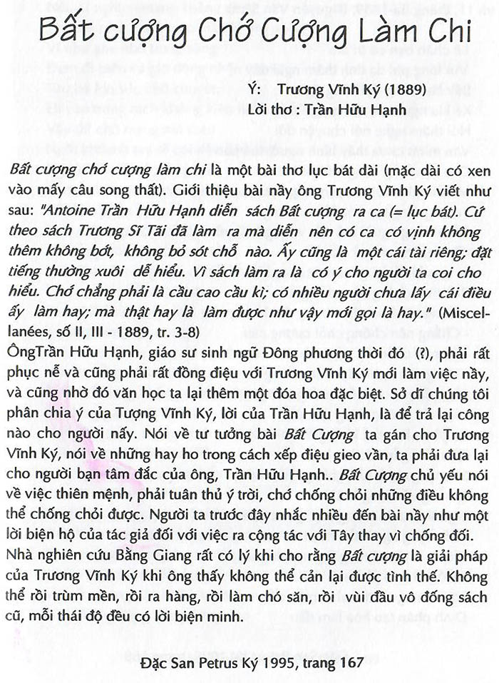 Bất Cượng Chớ Cượng Làm Chi Ý: Trương Vĩnh Ký – Lời thơ: Trần Hữu Hạnh (nguồn: ĐS Petrus Ký Houston 1995) Share this: Click to share on X (Opens in new window) X Click to share on Facebook (Opens in new window) Facebook Like Loading...
