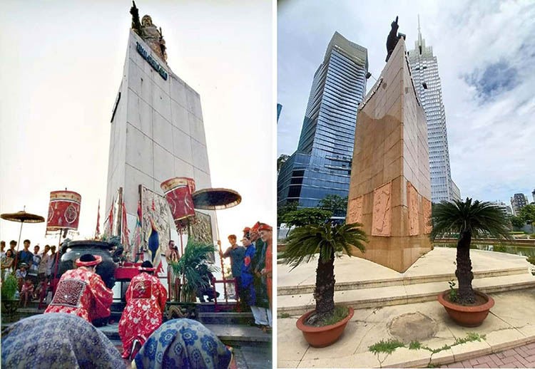 Lễ Giỗ Đức Thánh Trần trước tượng đài Trần Hưng Đạo ở công trường Mê Linh vào những năm đầu 1990 (Ảnh: Phong Quang) và phía trước tượng đài Trần Hưng Đạo còn dấu vết bệ đặt lư hương, đã di dời ngày 17.2.2019 (Ảnh Phúc Tiến chụp lúc 10g sáng 14.9.2021)