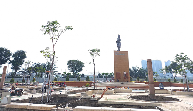 Công việc tôn tạo tượng đài Trần Hưng Đạo đang khẩn trương hoàn tất. Ảnh chụp lúc 10 giờ sáng ngày 29.1.2022. Ảnh: Phúc Tiến