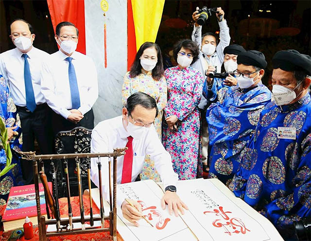 Bí thư Thành ủy Nguyễn Văn Nên thực hiện nghi thức khai bút đầu năm trong Lễ hạ nêu và khai ấn tại lăng Tả quân Lê Văn Duyệt sáng ngày 7.2.2022 (Mùng 7 Tết Nhâm Dần). Ảnh: Trang tin Thành ủy TP.HCM