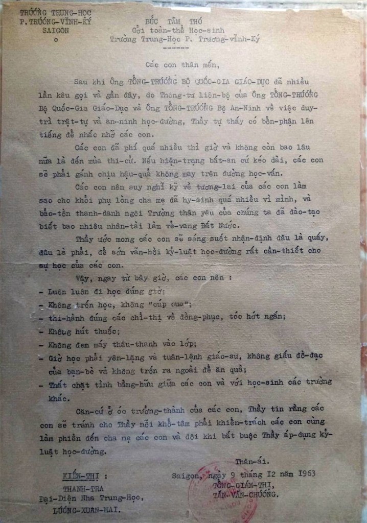 Bức Tâm Thư của Thầy Tăn Văn Chương gởi toàn thể học sinh Trường Trung học P. Trương Vĩnh Ký
