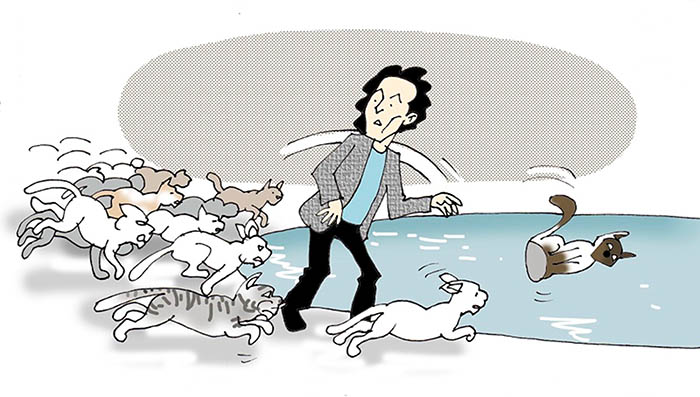 Trong cơn hoảng loạn như trong phim của Hitchcock, Chú quay về phía mặt nước và ném bức tượng Mèo ra càng xa càng tốt. Thật ngạc nhiên, tất cả những con mèo chạy vượt qua mặt Chú và nhảy ùm xuống nước nơi bức tượng đã chìm xuống.