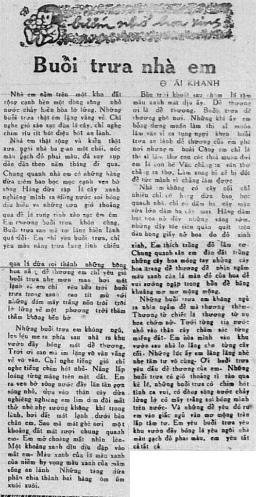 Nhà em thật rộng và kiểu thật xưa, ngôi nhà ba gian một chái, nóc màu gạch đỏ phai màu, đã suy sụp dần dần theo năm tháng đi qua. Chung quanh nhà em có những hàng dừa xiêm bao bọc trồng cạnh ven bờ sông. Hàng dừa rợp lá cây xanh, nghiêng mình ra dòng nước soi bóng dịu hiền và những cơn gió thoảng qua để lá rung rinh xào xạc êm êm. Em thương buổi trưa khôn cùng. Buổi trưa sao mà im lặng hiền lành quá đỗi. Em chỉ yêu buổi trưa, chỉ yêu màu nắng trưa lung linh chiếu qua lá dừa rọi thành những bông hoa nắng dễ thương, em chỉ yêu gió nhẹ buổi trưa mơn man hơi mát lạnh và em chỉ yêu bầu trời buổi trưa trong xanh cao tít mù với những đám mây trắng nõn trôi trôi lờ lững về một phương trời thăm thẳm không bến bờ.