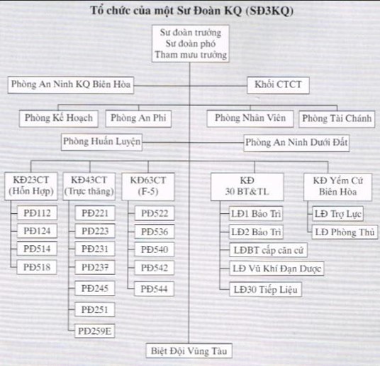 - Sư Ðoàn 3: đóng tại Biên Hòa, với Sư Ðoàn Trưởng là Chuẩn Tướng Huỳnh Bá Tính, có nhiệm vụ chính là yểm trợ các cuộc hành quân của Quân Ðoàn III, và gồm 3 Không Ðoàn Chiến Thuật 23, 43, và 63.