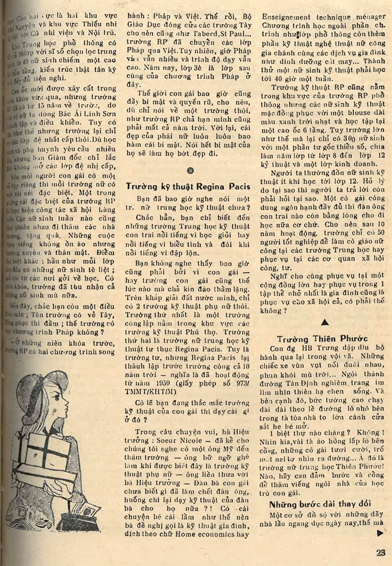 Các trường: Nữ TH Nha Trang, trường Nữ công Gia chánh Phú Thọ, trường Thánh Linh, trường Regina Pacis, trường Kỹ thuật Regina Pacis, trường Thiên Phước, trường Thánh Mẫu Gia Định.