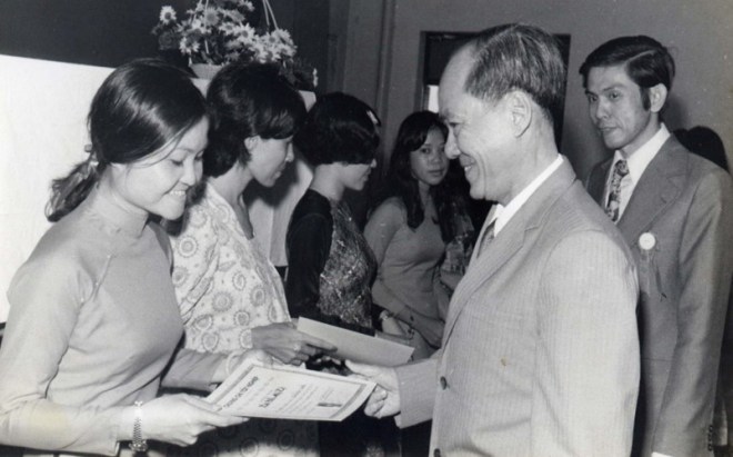 Giáo Sư Nguyễn Ngọc Huy, Viện Trưởng Viện Đại Học Sài Gòn, trao chứng chỉ tốt nghiệp cho học viên tại Lễ Bế Giảng Khóa Huấn Luyện