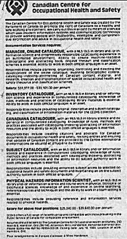 Tháng 7-1984, một hôm đọc tờ nhật báo The Globe and Mail tôi thấy có một thông cáo tuyển nhân viên của một cơ quan của Chính Phủ Liên Bang Canada, tại thành phố Hamilton, tỉnh bang Ontario, chuyên cung cấp thông tin về an toàn lao động, có tên là Canadian Centre for Occupational Health and Safety (CCOHS) = Centre canadien d’hygiène et de sécurité au travail (CCHST). Cơ quan cần tuyển một lúc 5 nhân viên, một chuyện rất hiếm có, cho bộ phận Documentation Services của họ, gồm có: