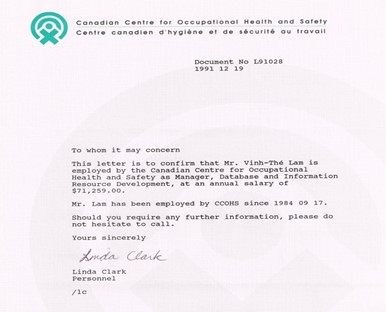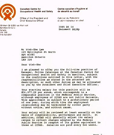Ngày 15-8-1984, tôi được CCOHS mời đến phỏng vấn và ngày 23-8-1984 cơ quan CCOHS gởi văn thư chính thức nhận tôi làm Inventory Cataloguer với lương năm là $27.491 đô la Canada: