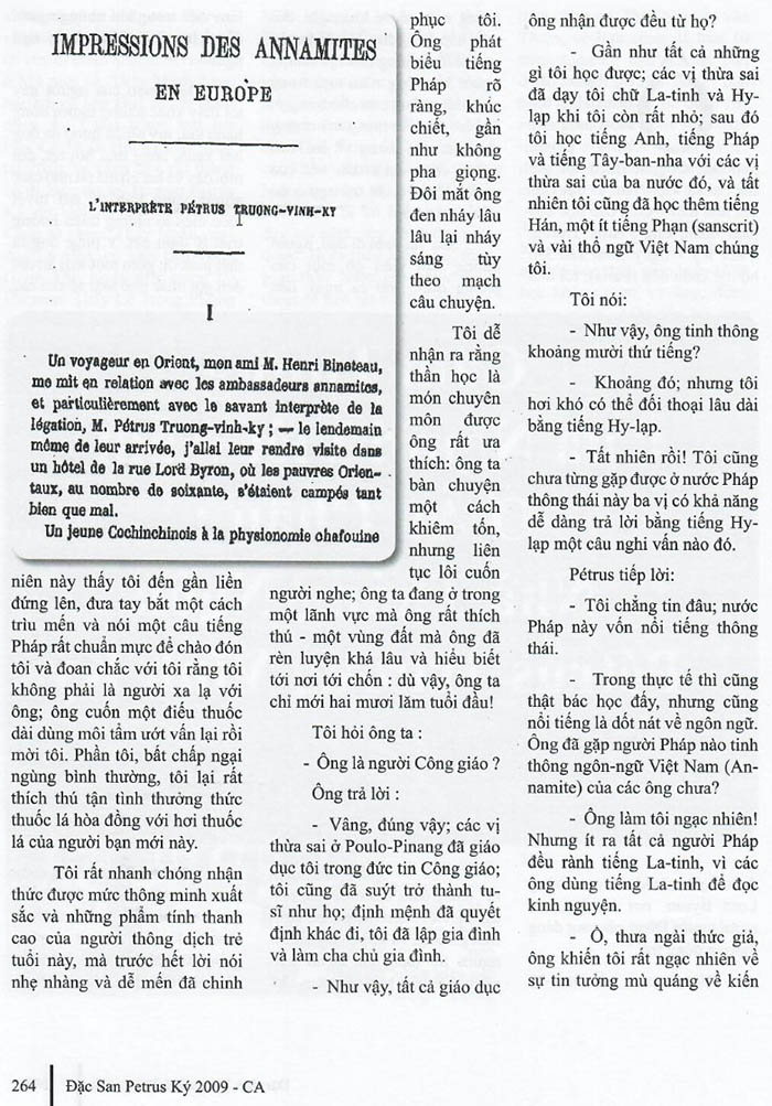 Cảm Tưởng Của Người Việt-Nam Ở Âu Châu: Nhà Thông Ngôn Petrus Trương Vĩnh Ký
