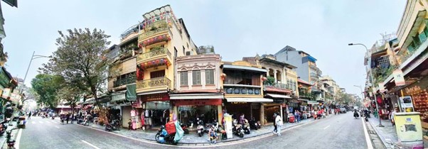 Nhà số 10 Hàng Đào (bảng hiệu màu đỏ) và nhà số 4 Hàng Đào (cuối cùng bên phải giáp ngã tư) là hiệu buôn tơ lụa và trụ sở Đông Kinh Nghĩa Thục vào năm 1907 (ảnh chụp 9.2023).