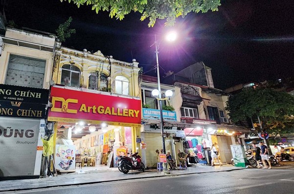 Nhà số 10 Hàng Đào (bảng hiệu màu đỏ) và nhà số 4 Hàng Đào (cuối cùng bên phải giáp ngã tư) là hiệu buôn tơ lụa và trụ sở Đông Kinh Nghĩa Thục vào năm 1907 (ảnh chụp 9.2023).