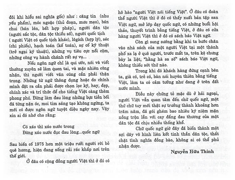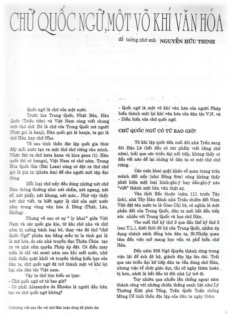 Chữ quốc ngữ, một võ khí văn hóa Nguyễn Hữu Thinh (Nguồn: Nội san số 51 – Hè 2007, Hội Ái hữu Trung học Petrus Trương Vĩnh Ký tại Pháp) Share this: Click to share on X (Opens in new window) X Click to share on Facebook (Opens in new window) Facebook Like Loading...