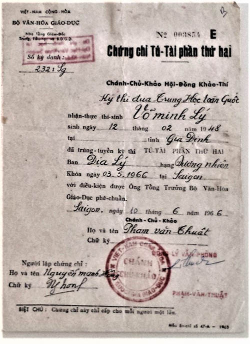 Về nhà mở bao thơ ra thì ngoài số tiền thưởng hai ngàn đồng, tôi được một ngạc nhiên lớn khác: Chứng chỉ Tú Tài II. Vậy là tôi đậu luôn Tú Tài II rồi sao? Tôi tức tốc đạp xe qua nhà Thầy Tiếu để hỏi thực hư. Thầy cũng ngớ ra, chưa thấy cái chứng chỉ nào như vậy. Gì đâu mà Ban: Địa lý; Hạng: Đương nhiên!. Chứng chỉ của người ta thì Ban: A, B, hoặc là C; Hạng thì Ưu, Bình, Bình thứ hoặc là Thứ. Tôi hoang mang cả mấy tuần cho tới khi biết chắc ăn là coi như mình được miễn thi Tú Tài II phổ thông. Với cái chứng chỉ Tú Tài không giống ai ấy, tôi đã nghe lời bạn bè nộp đơn xin học bổng và đã được chọn đi du học ở Mỹ năm 1967.