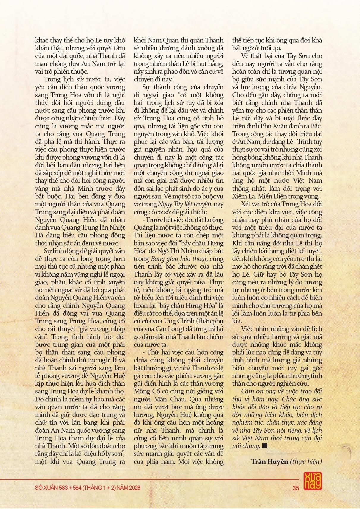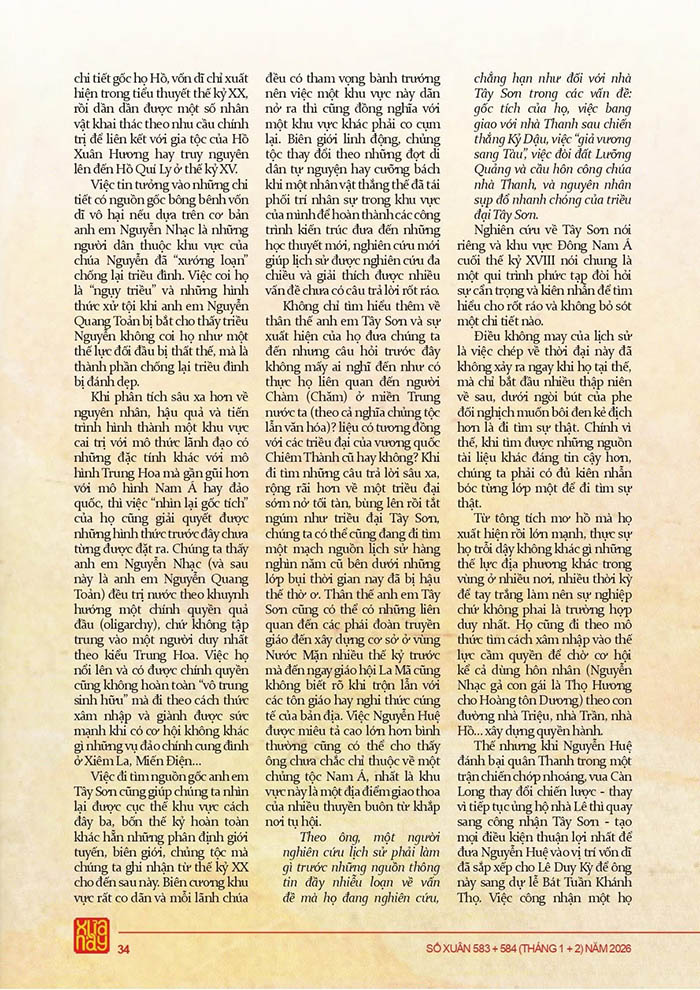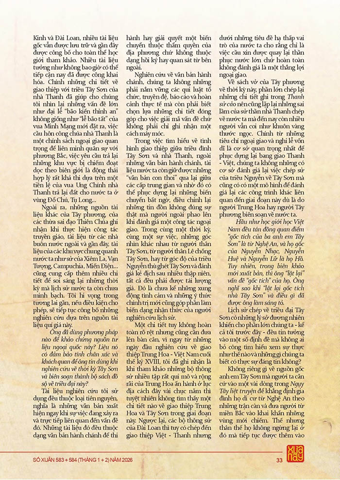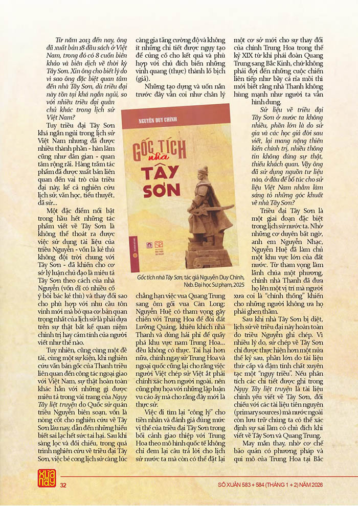 Trong những người nghiên cứu đương đại về triều Tây Sơn, có lẽ ít người viết khỏe như TS Nguyễn Duy Chính. Ở tuổi U80, ông vẫn kiên trì đóng góp, đưa ra những tư liệu và kiến giải mới về một vương triều ngắn ngủi (chưa tới 25 năm: 1778-1802) nhưng quan trọng trong lịch sử Việt Nam. Gần đây ông có ra mắt hai cuốn sách mới ở Việt Nam nên tạp chí Xưa và Nay có cuộc phỏng vấn do Trân Huyền (TDAS) thực hiện, đăng tạp chí Xưa & Nay số Tháng 1+2/2026 (Chào Xuân Bính Ngọ 2026), trang 31-35.