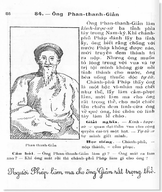 ‘Riêng tôi, có một sự kiện mà tôi nhớ mãi. Một hôm, năm 1934, lúc tôi đang nghê nga về tài đức của Phan-thanh-Giản trong cuốn Quốc văn giáo khoa thư lớp ba thì bác tôi tới chơi. Bác tôi là một chiến sĩ Xô-viết Nghệ-Tĩnh mới ra tù. Bác giật sách, xé vụn trang giấy và viết cho thầy học tôi, bạn bác, mấy chữ như sau: “Anh T. có lẽ không nên cho con em ta noi gương xấu của loại Phan-thanh-Giản, Đỗ-hữu-Vị, Trương-vĩnh-Ký”.