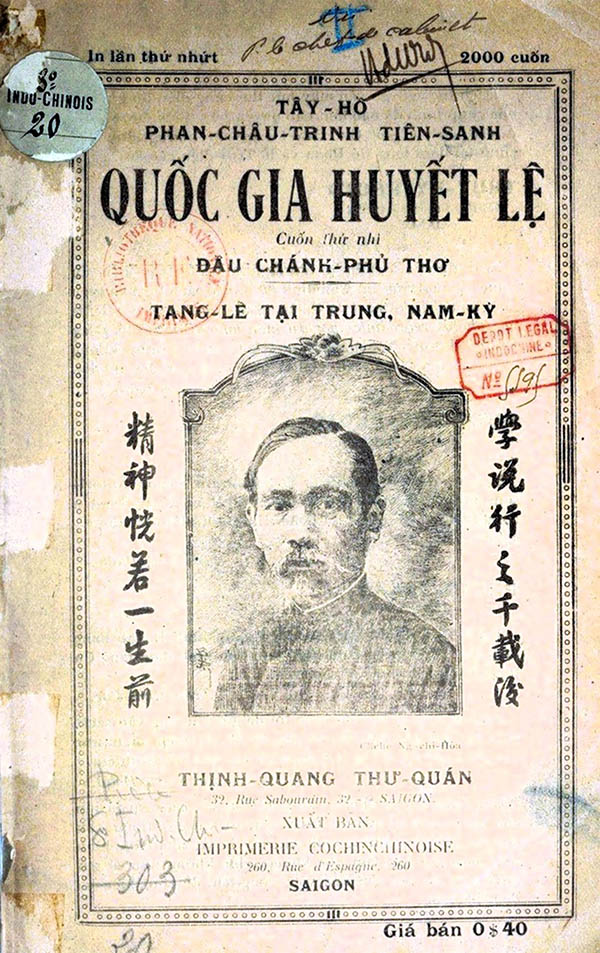 Trang bìa sách “Quốc gia huyết lệ” có chân dung cụ Phan Chu Trinh