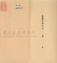 [26] Quốc Lập Cố Cung Bác Vật Viện (Đài Bắc), tấu thư của Gia Khánh ngày mồng 2 tháng Bảy Gia Khánh 7, đáng án số hiệu 094243-a.
