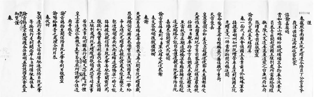 Quốc Lập Cố Cung Bác Vật Viện, Cung Trung Đáng Tấu Triệp, triều Gia Khánh số hiệu 088829. Bản tâu của Cát Khánh về việc thân thần An Nam quốc vương Nguyễn Quang Toản là Nguyễn Quang Triệu cung kính đến cửa quan thay mặt nhận lãnh dụ chỉ và các món được thưởng liệu có được không xin chỉ để thi hành.