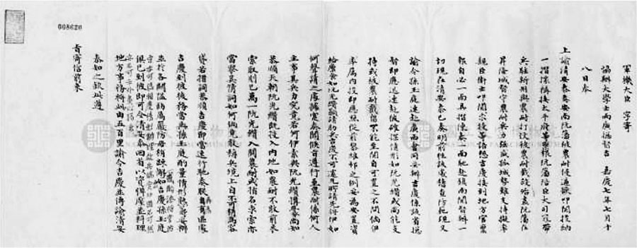 [26] Quốc Lập Cố Cung Bác Vật Viện (Đài Bắc), tấu thư của Gia Khánh ngày mồng 2 tháng Bảy Gia Khánh 7, đáng án số hiệu 094243-a.