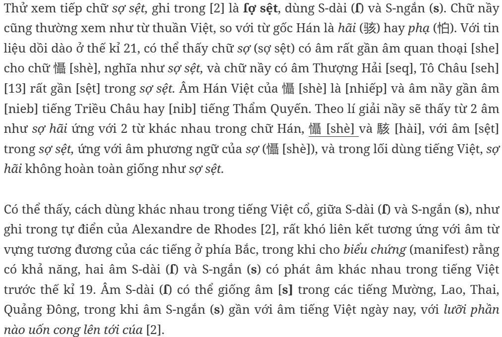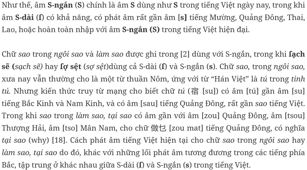 Trước hết, tự điển Alexandre de Rhodes [2] có ghi phát âm của S (S-ngắn) như trong chữ sao, ngôi sao: “S, chỉ thông dụng ở đầu tiếng mà thôi; vừa phần cứng hơn, s, của chúng ta, gần như gấp đôi; vừa phần huýt gió yếu hơn: khi phát âm nó, lưỡi phần nào uốn cong lên tới cúa, thí dụ, sa, cadere (đổ, ngã, sa); không bao giờ gặp nó ở giữa, hay ở cuối tiếng”.