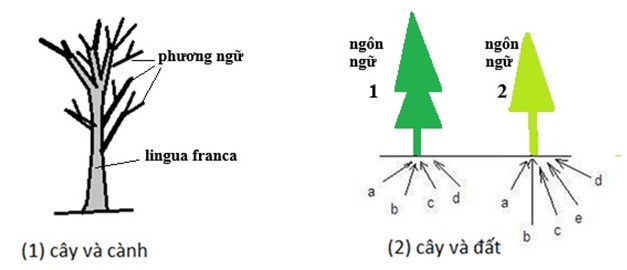 Chuyện nầy, và ngay cả liên hệ giữa ngôn ngữ và chủng thể DNA, sẽ không thành vấn đề trong mô hình ngôn ngữ cây và đất. Mô hình cây và đất khác với mô hình cây và cành, cả hai được tóm tắt bằng sơ đồ của Hình 2. Mô hình cây và cành (Hình 2(1)) là mô hình chính yếu dùng trong ngữ học và khoa học nhân văn, kể cả ngành Hán Nôm, từ xưa đến nay. Mô hình nầy phù hợp và đồng thuận với nguyên lí một dân tộc một ngôn ngữ. Trong mô hình nầy, tiếng một dân tộc thường xem như một cành hay nhánh của toàn cây, hay thân cây, và toàn thể cây là đại biểu cho một nhóm ngôn ngữ, Cũng có thể xem nhánh cây như đại diện cho phương ngữ, và cây đại biểu cho tiếng cả nước, hiểu như cây tiêu biểu cho tiếng quốc ngữ hay lingua franca.