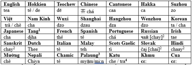 Chữ chè trong tiếng Việt có 2 ngữ nghĩa khác nhau, một là thức ăn ngọt nấu với nước, và hai là ngữ âm khác với trà nhưng mang nghĩa như trà. Bảng Đối Chiếu của chữ tea (chè / trà) trình bày ở đây cho thấy chữ trà trong nhiều thứ tiếng trên thế giới là một từ vay mượn từ nhiều “phương ngữ” ở nước Trung, nơi xuất phát và dùng trà như một thứ giải khát đã có lâu đời trong lịch sử.