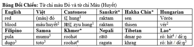 GHI CHÚ: 1. Máu lợn (trư hồng) với chữ hồng=máu. Âm [hung] (紅) cũng là âm chỉ bầu trời (màu đỏ) [hung] (空); 2. Huyết giống âm chỉ máu: Gwaed (Welsh), hyut 血 (Quảng Đông), huêh (Triều Châu), vér (Hungary), whero (Maori); 3. Âm chữ máu gần như âm [mud] tiếng Sumer cách đây trên 5000 năm, âm [Máóhk] của người Blackfoot Indians ở Canada, [dmar] tiếng Tibet (Tây Tạng) nghĩa màu đỏ; 3. Hai âm [dugo] (Phi) và [toto] (Samoa) mang nghĩa máu, chứa âm [du] và [to] rất gần âm [đỏ] mang nghĩa màu đỏ; [mumu] tiếng Samoa gần âm [mủ] trong máu mủ; 4. Giống rohita tiếng Sanskrit & Pali chỉ máu và màu đỏ [16]; 5. Tiếng Lào: dɛ̀ːŋ=đỏ, mạch máu; Giống liên hệ tiếng Thai: [daaeng]=máu & [lohng daaeng]= Tiêu chảy, tiêu ra máu [17]; Cũng giống liên hệ tiếng Phúc Kiến: 紅 [hông]= màu đỏ, và âm [au-hông] 呕血= ói ra máu, viết với chữ 血 [huyết] [hueh], nhưng có thể đọc như [hông] (紅) chỉ màu đỏ. * Những tiếng nầy dùng chung 1 từ chỉ máu và màu đỏ.