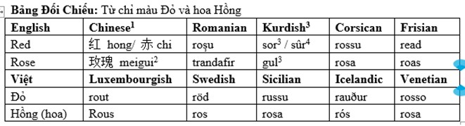 Chữ hồng chỉ màu hoa hồng trong tiếng Hoa là 玫红 [meihong] với chữ 玫 [mei] hay 玫瑰 [meigui] mang một nghĩa là đá ngọc màu đỏ, và cũng mang nghĩa là cây hoa hồng. Cũng cần ghi nhận là màu hồng trong tiếng Việt không phải là màu đỏ như chữ 紅 [hong] trong tiếng Trung. Mầu hồng tiếng Việt là màu hồng nguyên thủy của cây hoa hồng ở trong rừng (xem các AI chatbot) tức là mầu pinky red. Liên kết ví phỏng giữa từ chỉ màu đỏ và từ chỉ hoa hồng giữa nhiều thứ tiếng được trình bày tiêu biểu trong Bảng Đối Chiếu ở trên.