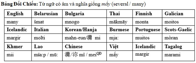 Dùng trò chơi chữ nghĩa sẽ thấy Chú có mấy người con? = Chú có bao nhiêu người con? Hay mấy người đó= những người đó, cho biết là mấy cũng mang nghĩa nhiều, những, trong khi sức mấy= sức bao nhiêu, cho biết mấy= nhiều, mang thêm tính ngờ vực hay bất định. Nghĩa đặc thù của mấy trong tiếng Việt, xưa và nay, do đó gồm mấy=nhiều+bất định. Nhưng cũng có khi, không phải bất định như vậy, như trong kiểu dùng mấy người= you guys. (Chữ mấy trong mấy người cũng có thể là biến âm của mầy, “đại từ ngôi số 2”.) Đặc biệt âm [mấy] rất gần với một âm trong từ vựng của nhiều tiếng khác nhau, nhất là các tiếng như Lao, Khmer, Myanmar, mang nghĩa như many, mấy, như trong Bảng Đối Chiếu.