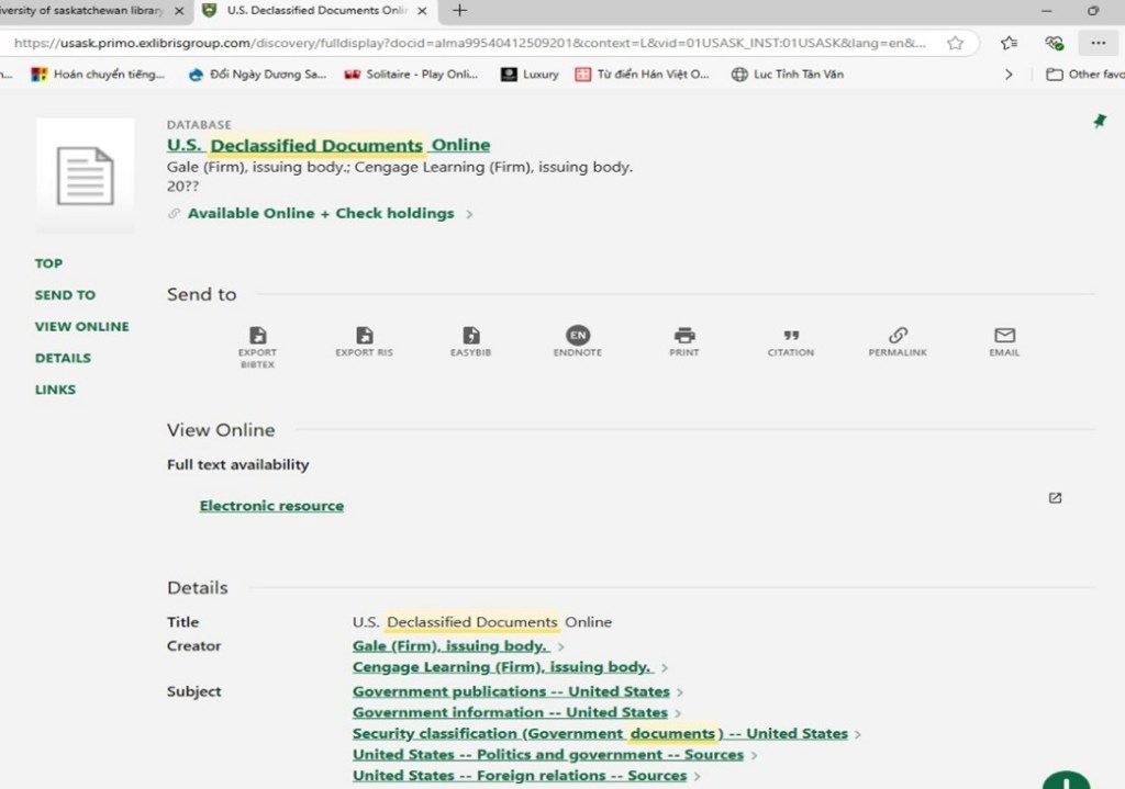 Tài liệu US Declassified Documents Online của Thư Viện Đại Học Saskatchew