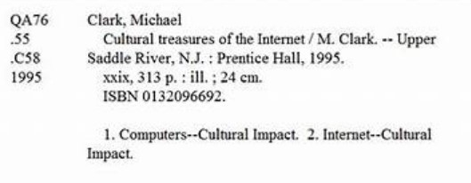 Dưới đây là ảnh của ký lục thư tịch cho cùng tài liệu, Cultural treasures of the Internet, đã giới thiệu bên trên trong tấm ảnh của một thẻ thư mục tiêu biểu: