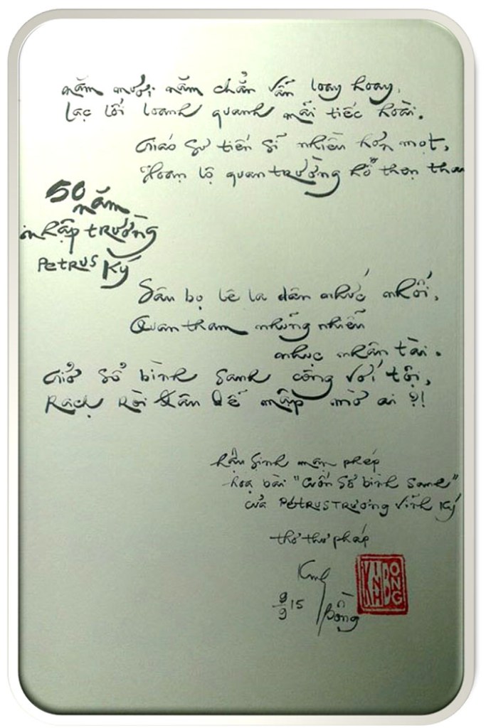 Ghi chú: vào dịp kỷ niệm 50 năm nhập trường Petrus Ký của niên khóa 65-72, tác giả viết bài thơ có tên trên, chuyển thành thư pháp bài thơ này và bài “Cuốn Sổ Bình Sanh” của cụ Petrus Ký.