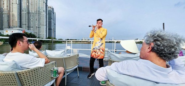 Du khách nước ngoài thưởng ngoạn trang phục và âm nhạc Việt Nam trong tour 45 phút trên sông của Saigon Water Bus.
