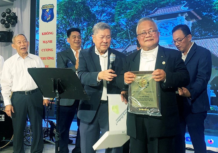 Ban chấp hành trao bằng khen cho ông Lê Anh Dũng (phải) về việc phát hành đặc san “Truyền Thừa 2024” của Hội Ái Hữu Petrus Ký Nam California. (Hình: Lâm Hoài Thạch/Người Việt)