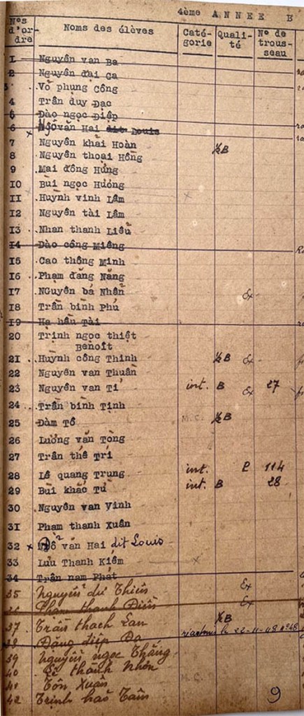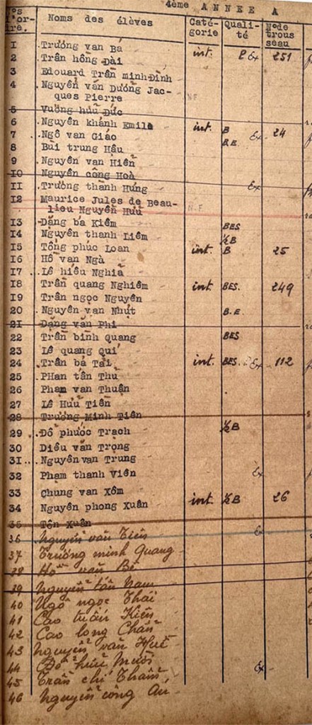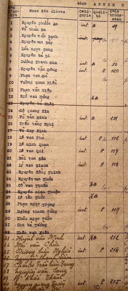 Danh sách học sinh các lớp trong năm học 1948-49 tại trường trung học Petrus Trương Vĩnh Ký Classes de 4ème année Lớp 4ème année A Lớp 4ème année A (Suite) Lớp 4ème année B Lớp 4ème année B (Suite) Lớp 4ème année C Lớp 4ème année C (Suite) Share this: Share on X (Opens in new window) X Share on Facebook (Opens in new window) Facebook Like Loading...