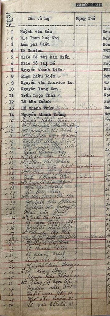 Danh sách học sinh các lớp trong năm học 1955-56 tại trường trung học Petrus Trương Vĩnh Ký Lớp Philosophie Lớp Philosophie Lớp Philosophie (Suite) Share this: Click to share on X (Opens in new window) X Click to share on Facebook (Opens in new window) Facebook Like Loading...