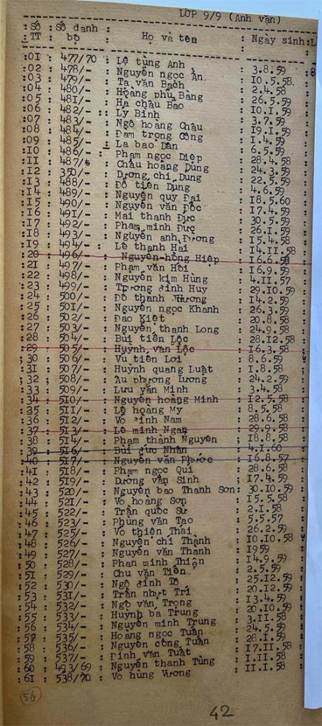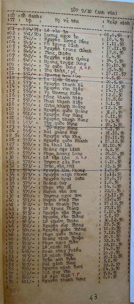 Danh sách học sinh các lớp trong năm học 1973-74 tại trường trung học Petrus Trương Vĩnh Ký Danh sách các lớp 9 Lớp 9/1 Lớp 9/2 Lớp 9/3 Lớp 9/4 Lớp 9/5 Lớp 9/6 Lớp 9/7 Lớp 9/8 Lớp 9/9 Lớp 9/10 Share this: Share on X (Opens in new window) X Share on Facebook (Opens in new window) Facebook Like Loading...