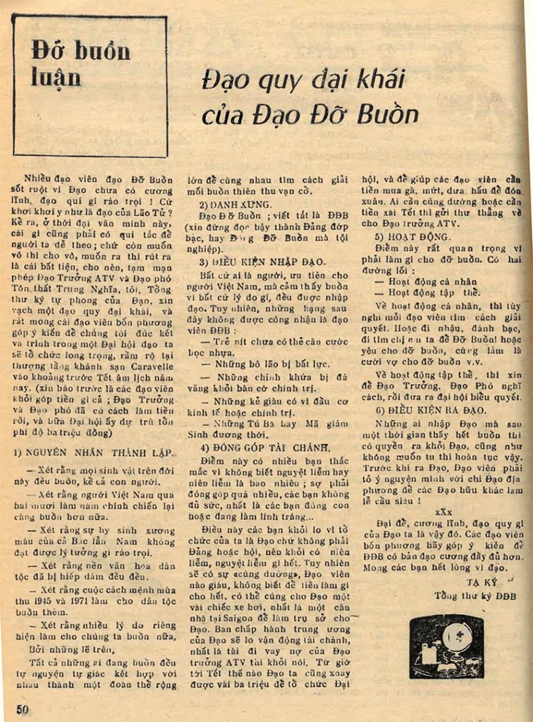 Đạo quy đại khái của Đạo Đỡ Buồn Tạ Ký, Tổng thư ký ĐĐB (nguồn: tuần báo Đời số 112, ngày 9-12-1971) Võ Phi Hùng sưu tập Share this: Share on X (Opens in new window) X Share on Facebook (Opens in new window) Facebook Like Loading...