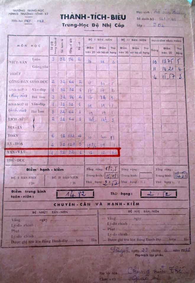 Giữa không gian tĩnh lặng của nhà thờ cốt, nơi chùa Linh Phong, chiếc hủ tro nho nhỏ được đặt trong lồng kính, hướng về phía Đức Phật từ bi, trên có di ảnh của thầy, dáng tiên phong đạo cốt, hình như đang nhìn con với vẻ rộng lượng thứ tha. Và rồi không thể kìm nén cảm xúc, nước mắt con cứ đầm đìa tuôn chảy. Ngày ấy, năm lớp đệ tam, con học môn Vạn vật với thầy ( NK 67-68 ) Làm sao con quên được những hình ảnh cũ về thầy: vóc dáng nho nhỏ, ngày ngày vẫn thong dong tản bộ trên đường Hồng thập tự (1) để tới trường. Tất cả kiến thức đều nằm trong đầu, thầy đến lớp thao thao giảng bài mà chẳng cần sách vở gì, gây sự thích thú cho đám học trò. Thầy rất công tâm, không thiên vị ai, không ghét bỏ bất cứ ai. Tuy vậy qua ánh mắt, con cảm nhận như thầy có phần nào đó, dành tình cảm yêu thương đặc biệt cho con. Vốn là đứa học trò khá dốt Toán, chỉ vì sĩ diện, vì tự ái, cùng lời khích tướng của bạn bè (2) mà con dám cả gan ghi tên theo học ban Toán ( ban B ) thay vì ban Vạn vật ( ban A ). Đã lỡ rồi, nên không muốn phụ lòng mẹ cha, con phải cố gắng nhiều trong thế ” đã leo lên lưng cọp ” (3). Tuy vậy kết quả môn Toán kỳ thi đệ nhứt bán niên may sao cũng chỉ vừa vặn trung bình ( 10/20, thứ hạng 19/52 ) trong khi kết quả bộ môn của thầy thì ” bét ” nhứt trong số các môn đã thi ( 12/20, thứ hạng 20 ). Khi trao lại bài thi cho học trò xem, cũng qua ánh mắt, con cảm nhận rằng thầy không vui, điều này càng được củng cố khi lời phê của thầy chỉ vỏn vẹn có 1 chữ ĐƯỢC!. Rất kính trọng thầy và không muốn cho thầy thất vọng, con tự nhủ thầm sẽ cố gắng hết sức vào đệ nhị bán niên. Thế nhưng sẽ chẳng bao giờ có đệ nhị bán niên cho năm lớp đệ tam nầy (4), bởi biến cố Tết Mậu thân nổ ra, trường học đều đóng cửa, nhà của bố mẹ cháy tan hoang, và từ đó con chẳng bao giờ được gặp lại thầy để có cơ hội chuộc lại lỗi lầm.